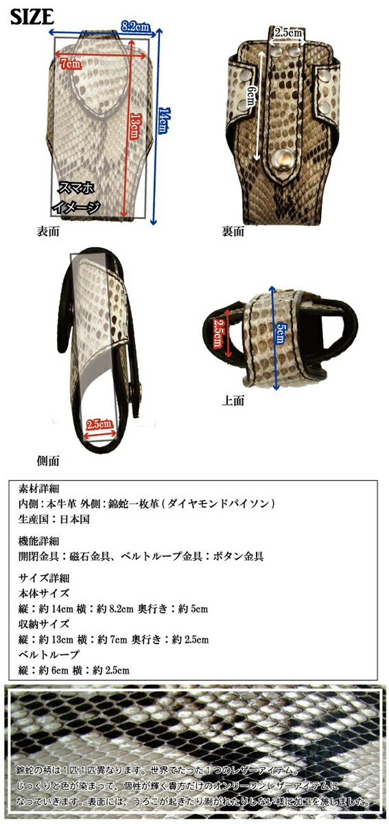 素材詳細 内側:本牛革 外側:錦蛇(ダイヤモンドパイソン)1枚革 生産国:日本国 機能詳細 フラップ:マグネット金具 ベルトループ:ボタン金具 サイズ詳細: 本体サイズ 縦:約14cm 横:約8.2cm 奥行き:約5cm 収納サイズ 縦:約13cm 横:約7cm 奥行き:約2.5cm ベルトループ 縦:約6cm 横:約2.5cm ※ご購入の際は、必ずサイズをご確認の上ご購入下さい。