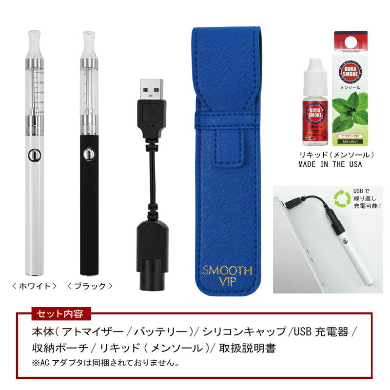 18022002 【モデル】 電子VAPE スムースビップX2 スターターキット 【サイズ】 ・本体:H145×φ11mm/29g ・アトマイザー容量:1.0ml ・メンソールリキッド:10ml ・収納青ケース:H202×W55×41mm 【吸引回数】 ・約350回(測定方法:1回2秒吸引-20kPa/5秒間隔) 【付属】 ・本体(アトマイザー/バッテリー) ・シリコンキャップ ・USB充電器 ・収納ポーチ ・リキッド(メンソール)(MADE IN USA) ・取扱説明書 ※ACアダプタは同梱されていません。